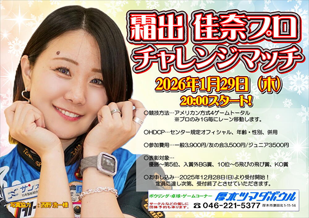 霜出佳奈プロチャレンジマッチ 2026年1月29日(木) 20:00スタート ○競技方法…アメリカン方式4ゲームトータル ※プロのみ1G毎にレーン移動します。 ○HDCP…センター規定オフィシャル、年齢・性別、併用 ○参加費用…一般3,900円/友の会3,500円/ジュニア3500円 ○表彰対象…優勝~第5位、入賞外BG賞、10位~5飛びの飛び賞、KO賞 ○お申し込み…2025年12月28日(日)より受付開始!定員に達し次第、受付終了とさせていただきます。