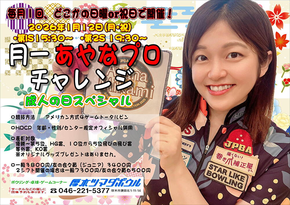 月一あやなプロチャレンジ 成人の日スペシャル 2026年1月12日(月祝) 第1シフト15:30~ 第2シフト19:30~ 〇競技方法 アメリカン方式4ゲームトータルピン 〇HDCP 年齢・性別/センター規定オフィシャル併用 〇表彰対象 優勝~第5位、HG賞、10位から5位飛びの飛び賞、等外賞、KO賞 〇一般3800円/友の会々員(ジュニア)3400円 2シフト開催の場合は一般7300円/友の会々員6500円