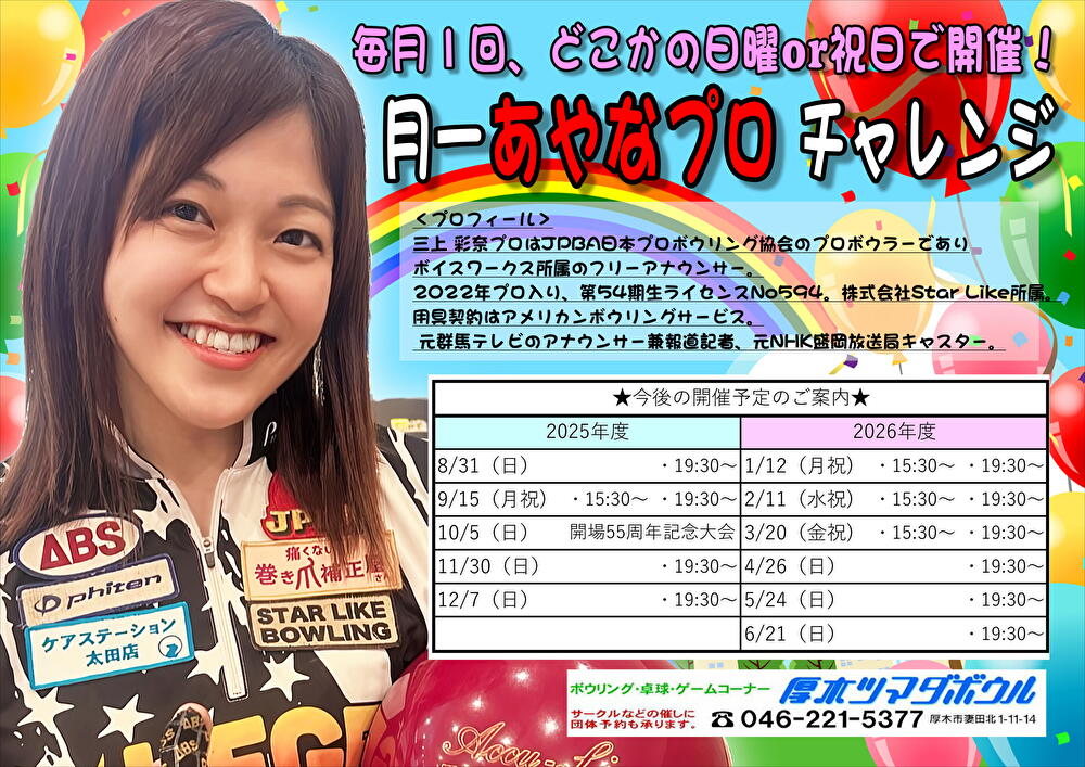 月一あやなプロチャレンジ 毎月1回、どこかの日曜or祝日に開催します! 〇競技方法 アメリカン方式4ゲームトータルピン 〇HDCP 年齢・性別/センター規定オフィシャル併用 〇表彰対象 優勝~第5位、HG賞、10位から5位飛びの飛び賞、KO賞 〇一般3800円/友の会々員(ジュニア)3400円 2シフト開催の場合は一般7300円/友の会々員6500円